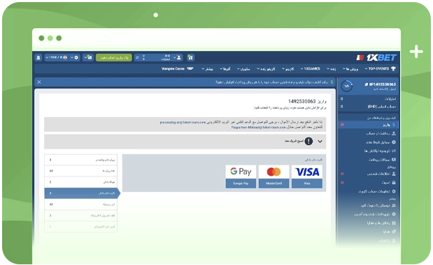 یکی دیگر از روش‌های واریز در سایت 1xbet، شارژ حساب از طریق کارت‌های بانکی است که به‌عنوان روشی ساده و سریع شناخته می‌شود؛ در این شیوه کاربران می‌توانند از درگاه‌های Visa، MasterCard و Google Pay برای انجام واریزهای امن و آسان استفاده کنند.